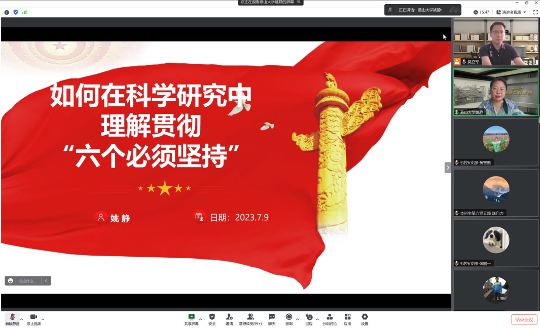 副院长姚静以《如何在科学研究中理解贯彻“六个必须坚持”》为题讲授主题教育专题党课。