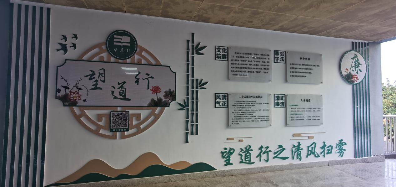 廉政文化上墙,清正廉洁入心。该院廉政文化墙立足“望道行”品牌,以“望道行之清风扫雾”为主题,共分为四个宣传板块,分别是文化筑廉、风清气正、奉公守法、清正廉洁。一段段警钟长鸣的廉政讲话,一条条令人警醒的廉政规定,营造出清正廉洁的文化氛围,传递着公正廉洁的价值理念。让看不见的文化有了看得见的载体,使全院党员教师在润物细无声中进一步坚定理想信念,筑牢政治忠诚,增强拒腐防变的能力。