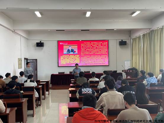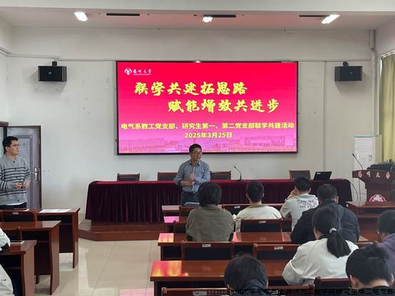 为深入学习贯彻全国两会精神、习近平总书记在参加江苏省代表团审议时的重要讲话精神,研一、研二支部开展“联学共建拓思路 赋能增效共进步”主题党日活动,特邀请电气系主任李生权老师参加,全体正式党员、预备党员、入党积极分子参加活动,研一支部书记彭茂鑫主持。