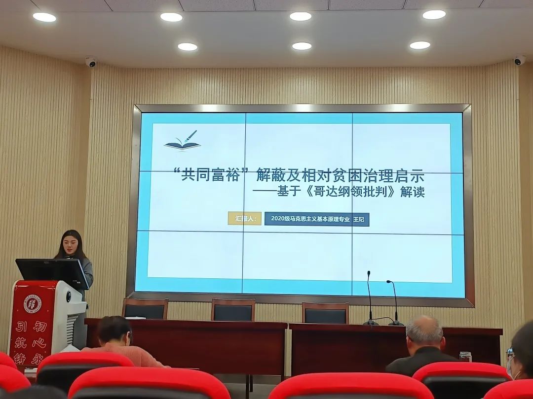 王玘同学以“‘共同富裕’解蔽及相对贫困治理启示——基于《哥达纲领批判》解读”为题,从回归文本解读、寻找理论支撑、总结实践经验、得到现实启示等四个方面阐述“共同富裕”以及“相对贫困”,从马克思主义经典著作与中国共产党的共同富裕实践中寻找理论指导与力量支持。