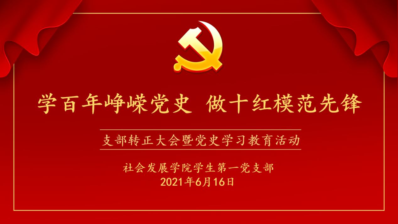 为壮大支部党员队伍,落实习近平总书记提出对“四史”学习要求,扬州大学社会发展学院学生第一党支部于6月16日下午2点召开“学百年峥嵘党史 做十红模范先锋”支部转正大会暨党史学习教育活动。