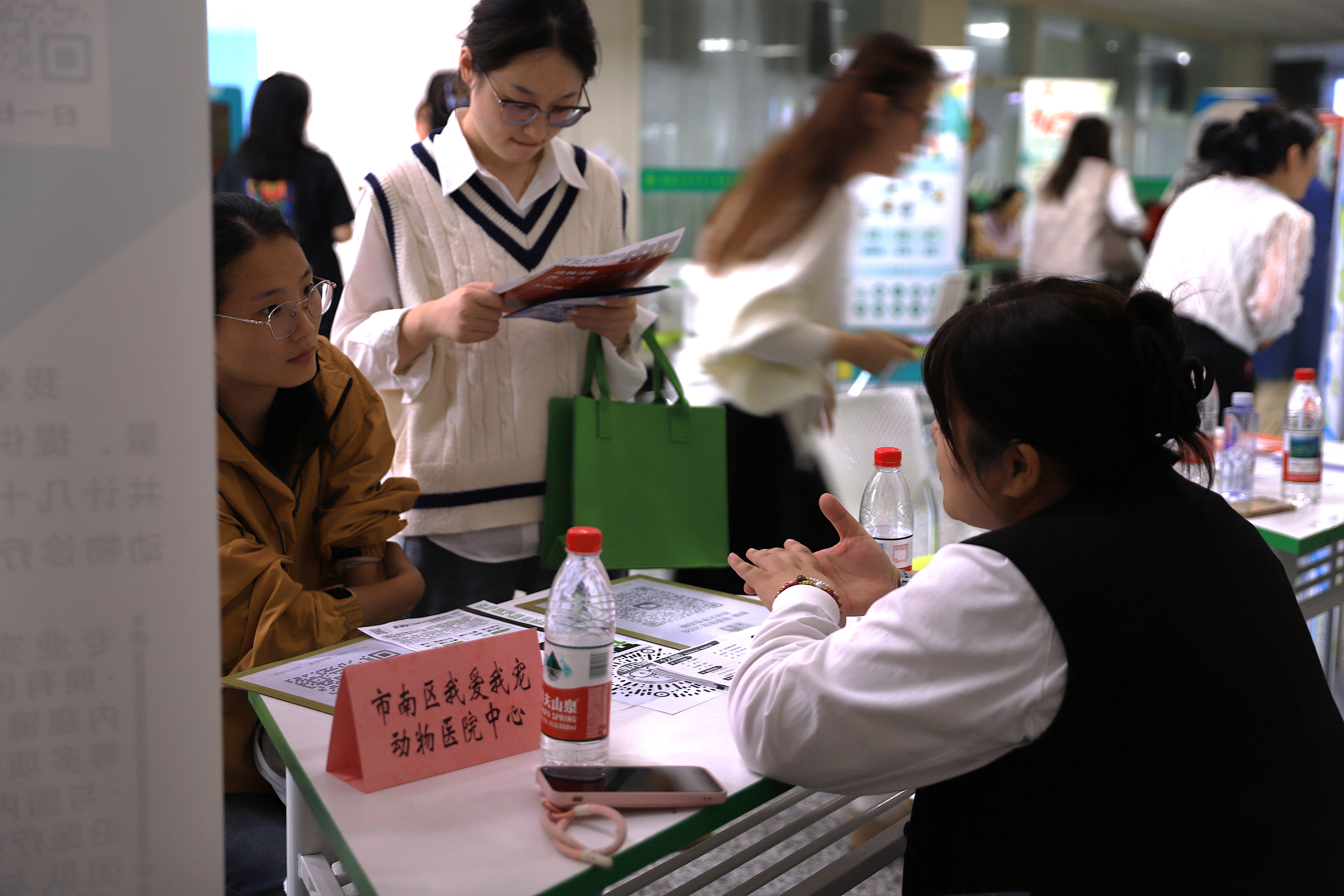 面对兽小医们的热情咨询,企业HR们始终以耐心与专业回应,他们用手指着招聘简章上的关键信息,清晰解读岗位职责、薪资福利、培训体系等内容或结合行业发展趋势,为学子们提供职业规划建议。