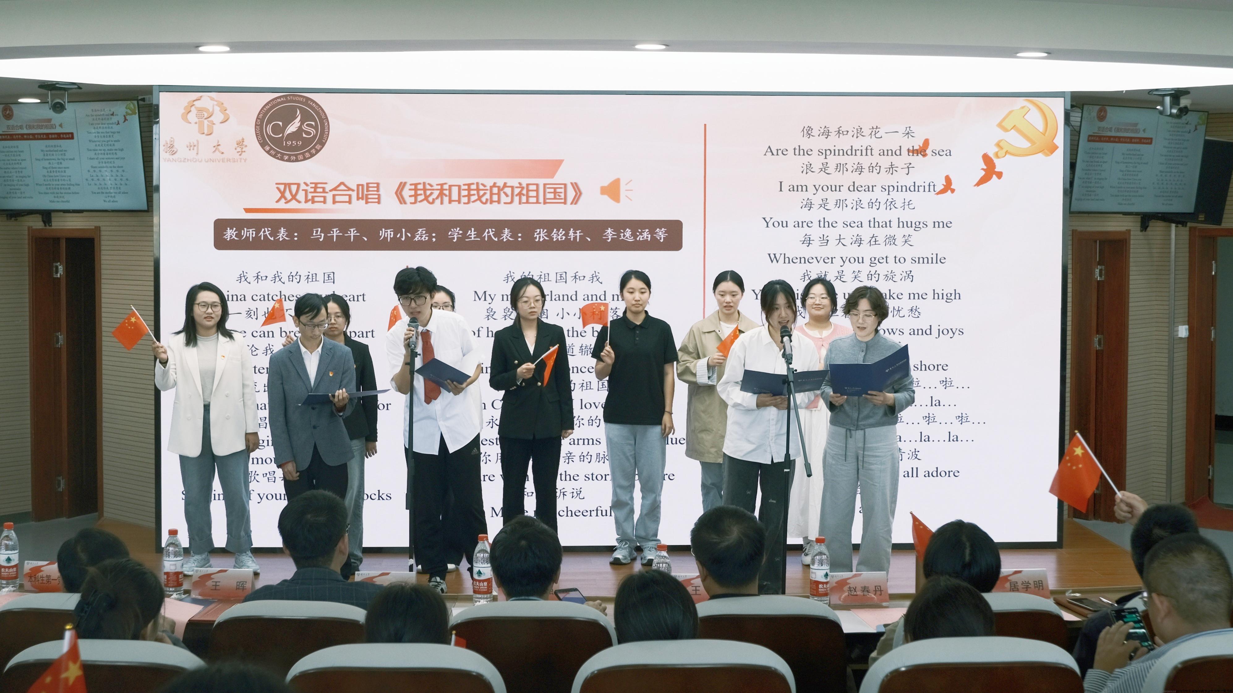 “我和我的祖国,一刻也不能分割,无论我走到哪里,都流出一首赞歌……”,每当响起这熟悉的旋律时,我们的心中也流淌着永不改变的情怀:这情怀,就是我们和祖国之间不可分割的血脉之情。习近平总书记指出:“对每一个中国人来说,爱国是本分,也是职责,是心之所系、情之所归。对新时代中国青年来说,热爱祖国是立身之本、成才之基。”在这激动人心的时刻,由教师党员代表马平平、师小磊,学生党员代表张铭轩、李逸涵领唱,全体与会人员双语合唱《我和我的祖国》,以歌声传递心声,以歌声抒发情感,用最嘹亮的歌声,表达了对祖国的无限热爱和美好祝愿。