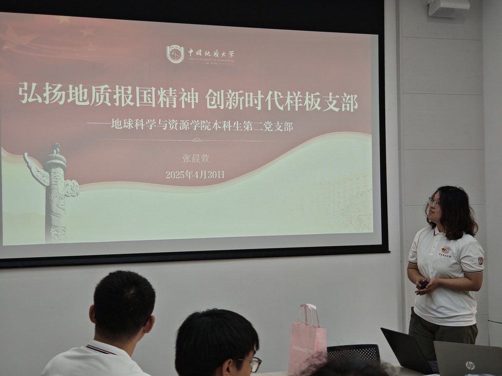 地学院本科生第二党支部副书记张晨萱同志围绕支部“一二三四五”党支部工作体系和“七个有力”展开支部建设经验分享。