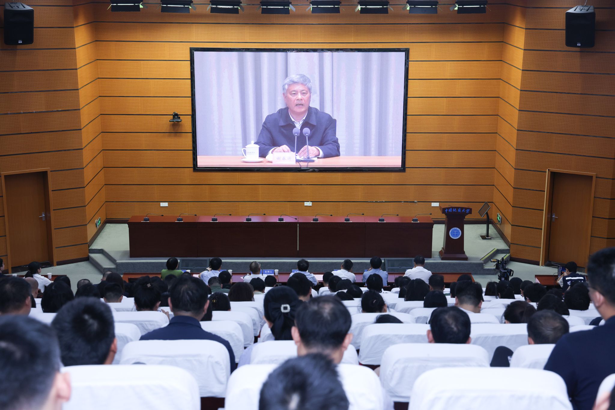 9月18日,我校组织开展2025年党员基本培训集中大课,采取集中观看视频方式学习中共中央党校(国家行政学院)谢春涛同志讲授的《中国共产党与中华民族伟大复兴》专题辅导报告。学校近9千名师生党员在两校区67个会场参加学习。武汉纺织大学原党委书记田辉玉、省委教育工委组织处四级调研员杨作成到校调研指导。