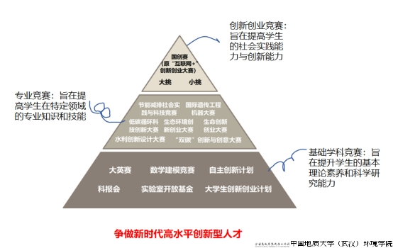 以创新创业赛事为载体。完善“创新创业活动-学科专业比赛-创新创业竞赛”赛事体系,制作学院创新创业竞赛指导手册。鼓励学生通过大创项目、实验室开放基金、自主创新计划等开展研究。定期举行环境文化科技节、科技论文报告会、研究生学术论坛和学术年会,举办绿色地球论坛、名家讲坛等活动,将科学研究成果转化为全国大学生节能减排大赛、水利设计创新大赛等孵化项目,特别优秀项目培育参加“iGEM”“国创赛”“挑战杯”和“创青春”等国内外重大赛事。