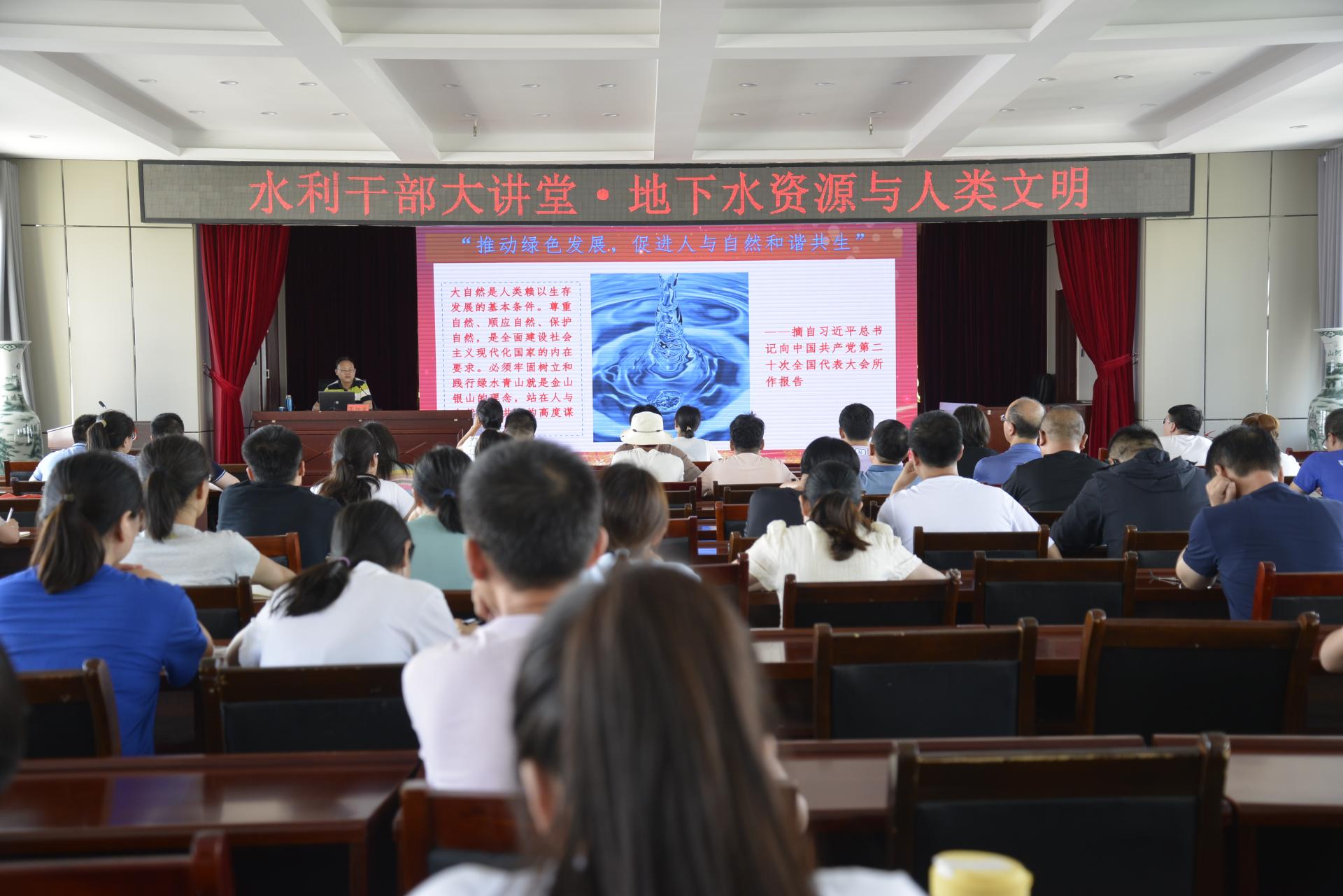 高旭波做客水利干部大讲堂,以《地下水资源与人类文明》开展学术讲座。他从水资源是人类文明孕育发展的源泉,水是生命之源开始讲起,介绍了水对文明和生命的重要性,表示井的出现,促进了人类文明的延伸和发展,并介绍了地下水的特征、地下水的分类、地下水流动系统、地下水开发利用等,阐述了水资源与水安全问题和地下水可持续发展问题。整场讲座深入浅出、简洁深刻,数据详实、资料丰富。