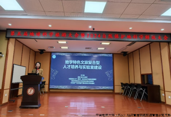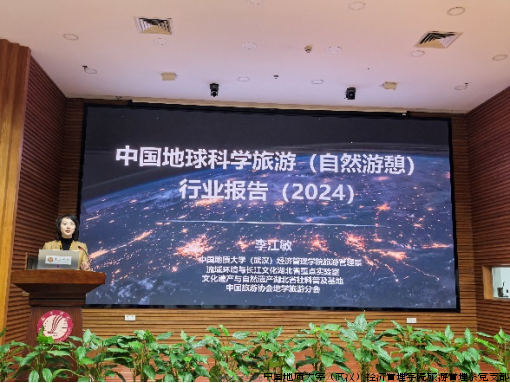 李江敏教授在会上进行了《中国地球科学旅游(自然游憩)行业报告(2024)》的成果发布以及《地学特色文旅复合型人才培养与实验室建设》的主题报告。