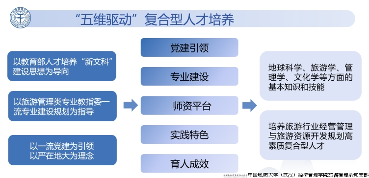 李江敏指出,地学特色文旅复合型人才培养,有助于实现师资互通、课程打通、科教融通、平台畅通的“四通”新局面。团队发挥“文化+旅游、地学+旅游、科技+旅游”专业特色,构建“认知+实践+科普+就业”的全员全程全方位育人模式,创新“师生联动、学研一体、教学相长”的协同发展机制。团队遵循国家导向、立足行业主流、突显地大特色,在以“五维驱动”培养成效为标准的专业建设中,指导学生掌握管理学、旅游学、地球科学、文化学等方面的基本知识和技能,通过理论学习和实践探索,培养地学特色的文旅高素质复合型人才。