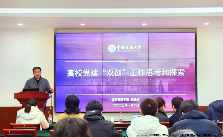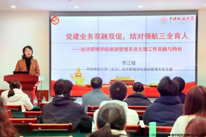 杨昌锐围绕《高校党建“双创”工作思考和探索》,介绍了学院党建双创工作经验,并从党组织领导和运行机制力争科学、规范、高效,政治把关力争严格、细致、全面,思想政治工作力争面对面、心贴心、实打实,基层组织制度执行力争规范、严格、精细以及推动事业发展有位、有为、有力等五方面分享经济管理学院党委“五融”工作法以及党建工作机制体制创新经验。李江敏基于《党建与业务双融双促,结对领航三全育人》,分享了旅游管理系党支部工作实践与特色,把祖国大好河山融入党课,以场景思政培育学生专业素养,用红色教育资源筑牢青年理想信念,实现“党建+教学科研+结对领航”,联动师生党团聚合力。专题报告获得了与会人员的一致好评,表示对学院和支部党建“双创”有了更深的认识和收获。
