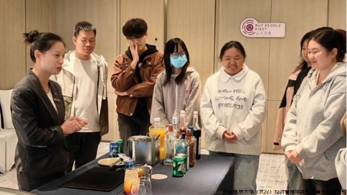 武汉光谷万豪酒店总经理刘子翰先生及酒店管理团队,会同任课教师经过细致沟通,为同学们量身打造了形式多样的“沉浸式”课堂,精心设置了酒店环境设施参观、采访发布与职业规划、特色调酒体验式等三大核心环节,兼顾认知学习、职业规划与体验式互动等多项教学目标。
