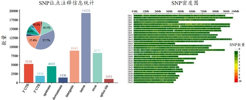 图6 “虹芯1号”SNP位点的染色体分布以及注释信息统计