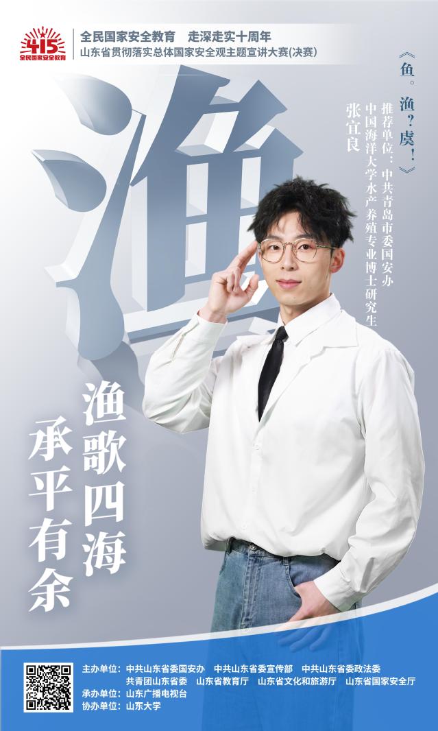 在第十个全民国家安全教育日即将来临之际,4月13日,“全民国家安全教育 走深走实十周年”——山东省贯彻落实总体国家安全观主题宣讲大赛(决赛)在济南举办。经过激烈角逐,中国海洋大学水产学院2024级水产养殖专业博士研究生张宜良同学获得第一名。