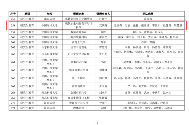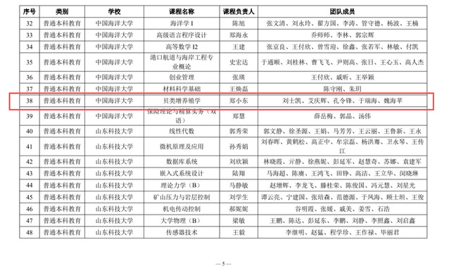 近日,山东省高等学校课程思政研究中心公布2025年省级课程思政示范课程(普通本科教育、研究生教育)名单,中国海洋大学水产学院本科生课程“贝类增养殖学”和研究生课程“现代水生动物营养与饲料学”成功入选,截至目前,学院累计有5门课程入选省级课程思政示范课。