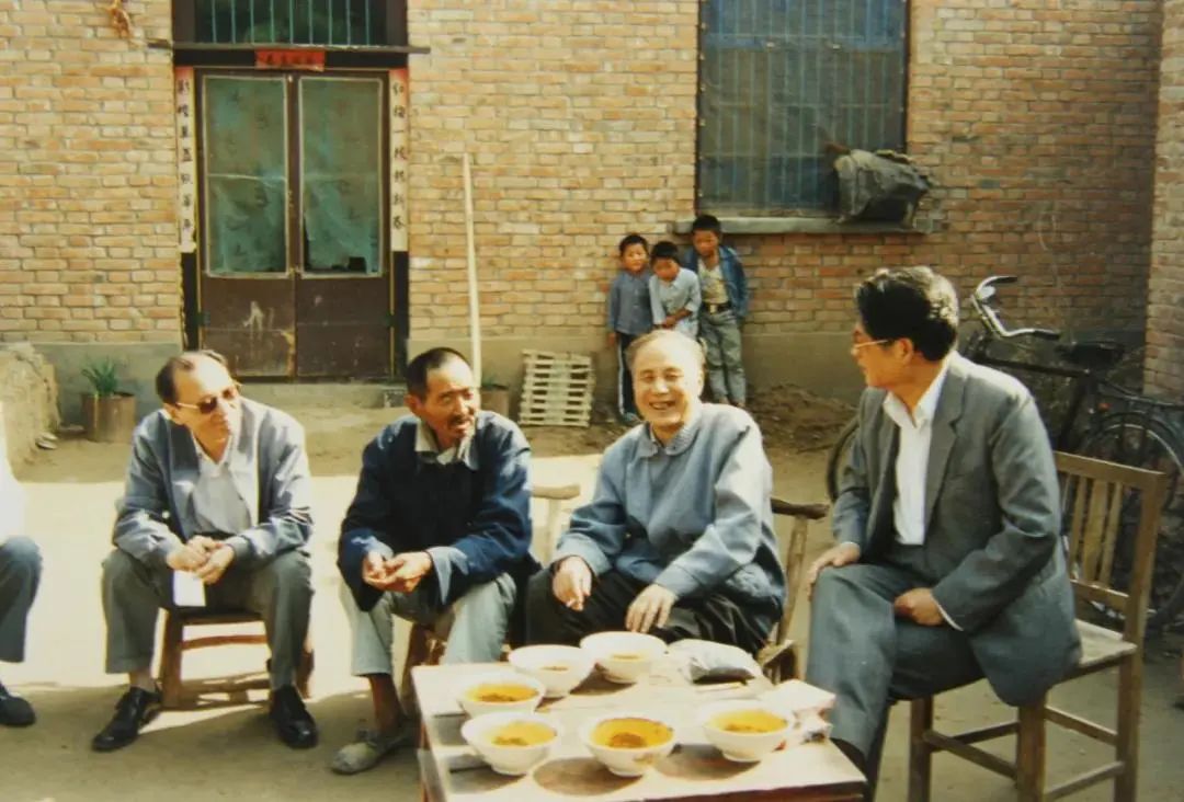 穆青与冯健(左一)、周原(右一)重访兰考,与农民交谈(1990年6月)