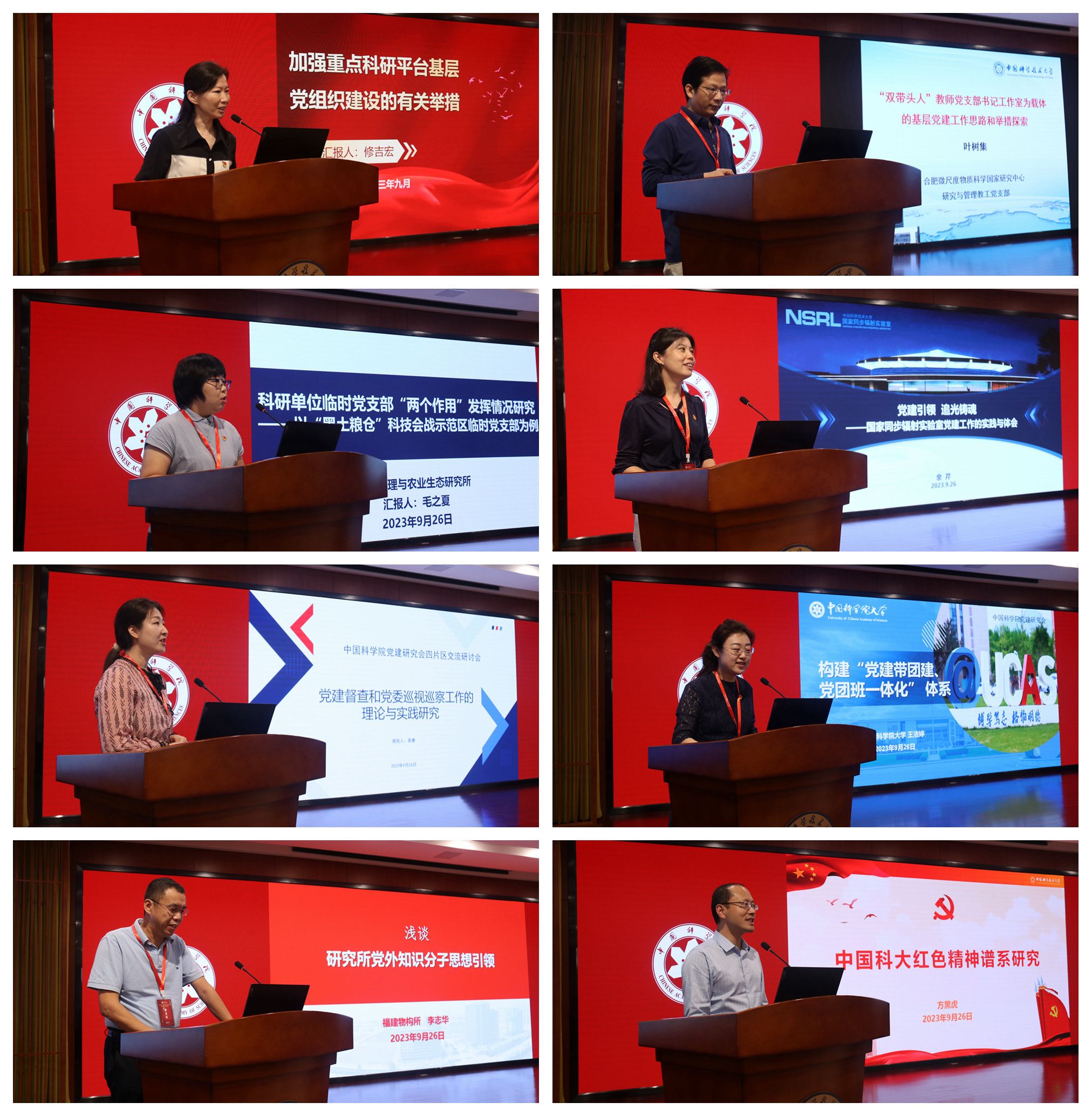 9月26日至27日,2023年中国科学院党建研究会四片区交流研讨会在我校召开。校党委书记舒歌群,中国科学院长春分院、上海分院、京区党建协作四片,中国科学院大学相关领导和嘉宾,校院级党组织书记参加研讨会。校党委常务副书记、党委组织部部长蒋一主持开幕式,中国科学院长春分院分党组书记、院长甘建国主持交流研讨环节会议。安徽省委党校(安徽行政学院)吴梅芳教授受邀作题为《学习二十大党章 维护党章权威》的辅导报告。辅导报告结束后,与会人员进行研究课题交流与党建工作交流,来自中国科学院党建研究会长春分会、上海分会、京区协作四片分会、中国科学院大学分会和中国科学技术大学分会的16位嘉宾分别作汇报。我支部叶树集同志作了题为《“双带头人”教师党支部书记工作室为载体的基层党建工作思路和举措探索》的报告。新闻报告见:http://news.ustc.edu.cn/info/1055/84774.htm。