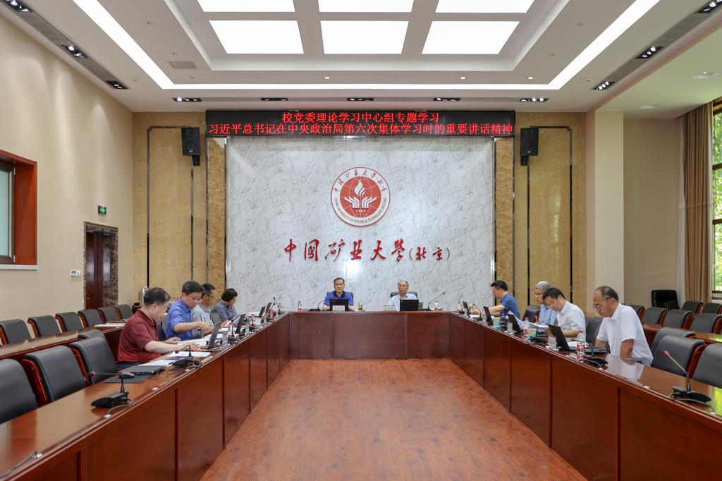 本网讯 7月10日下午,校党委理论学习中心组在1号办公楼200会议室,专题学习习近平总书记在中共中央政治局第六次集体学习时的重要讲话和在江苏考察时的重要讲话精神。校党委书记徐孝民主持学习会,中心组成员校长、党委副书记葛世荣,校党委副书记、纪委书记董晞,副校长刘波、崔希民,校党委副书记安宇,副校长谭凯、汪文生及其他成员参加学习研讨。