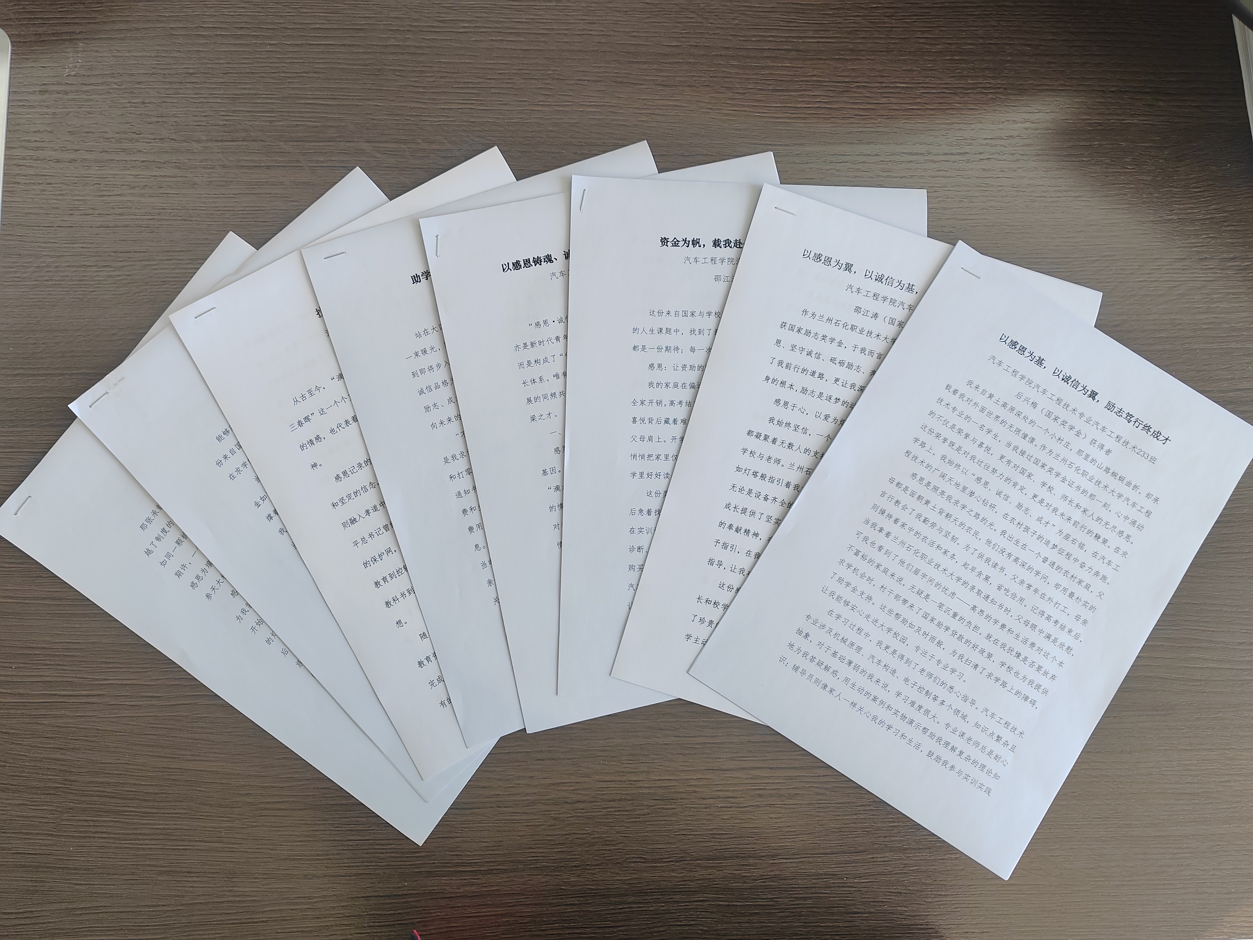 为深入宣传国家资助育人政策,充分展现当代青年学生的精神风采,激励家庭经济困难学生在国家政策扶持下成长成才,近日,汽车工程学院开展了2025年“感恩·诚信·励志·成才”主题征文活动,全院2025年受奖励资助的在校学生参加了活动。