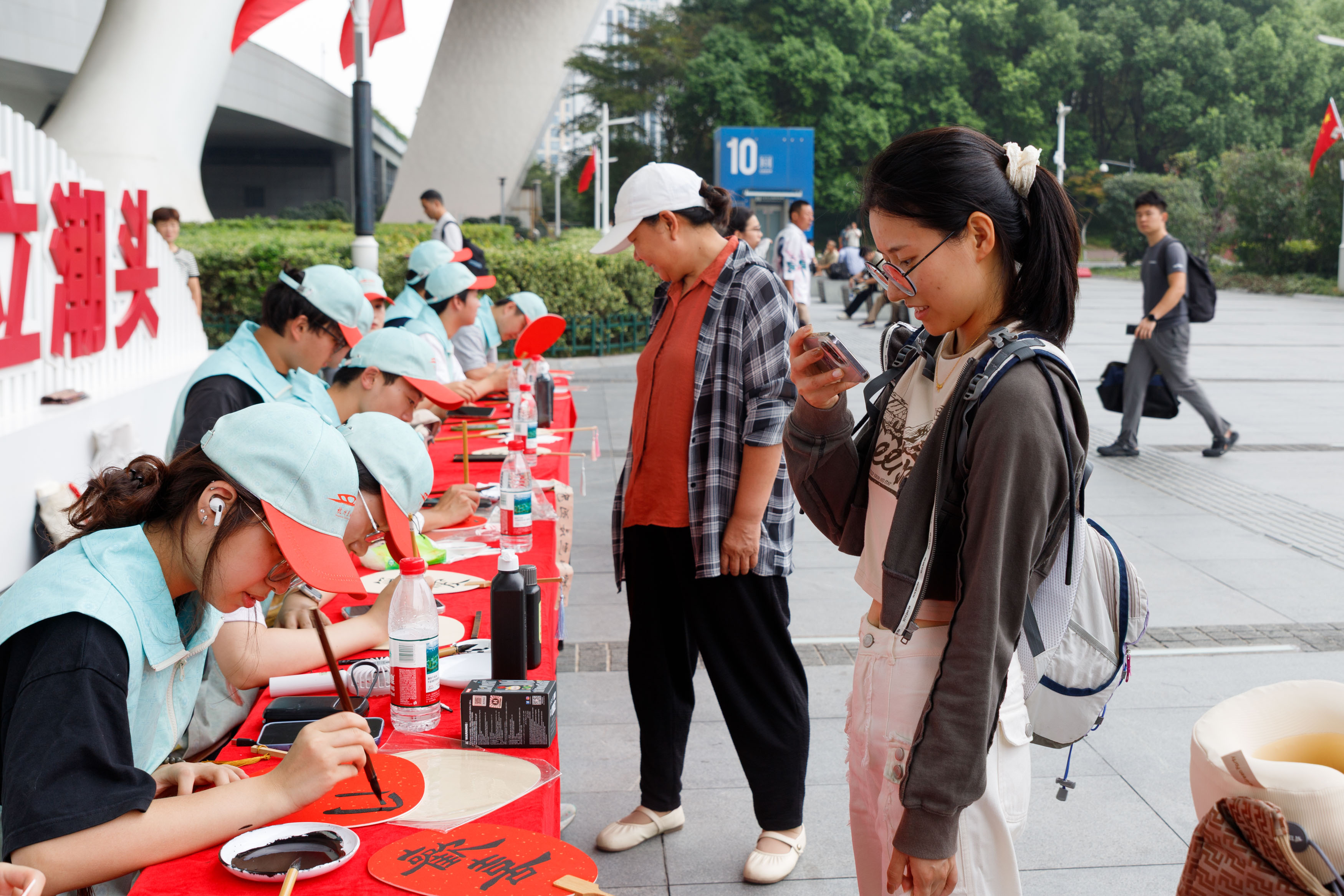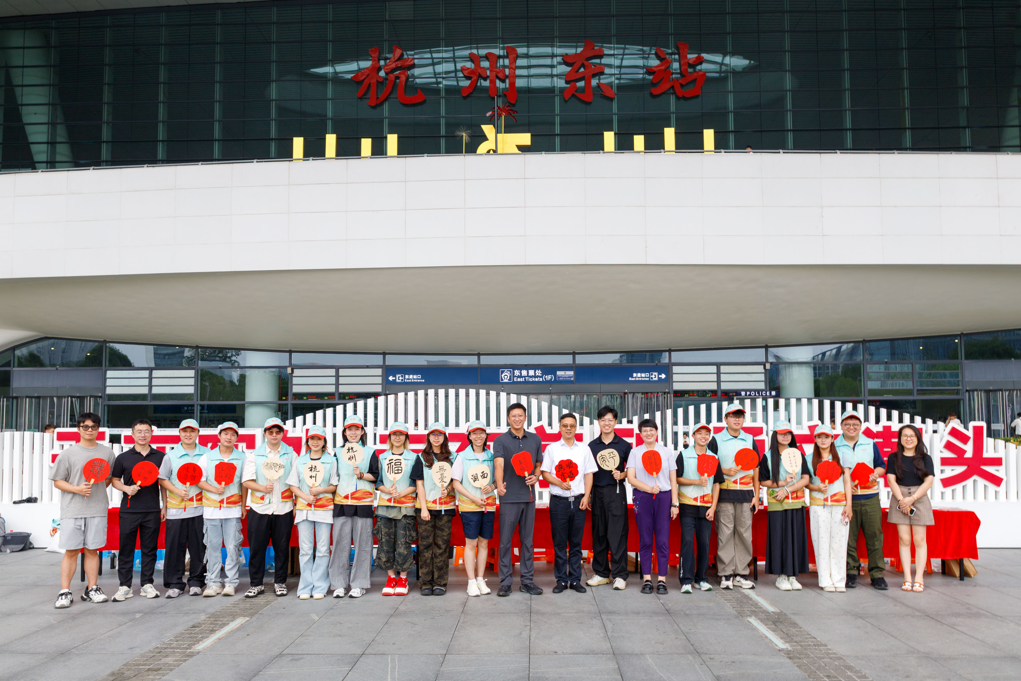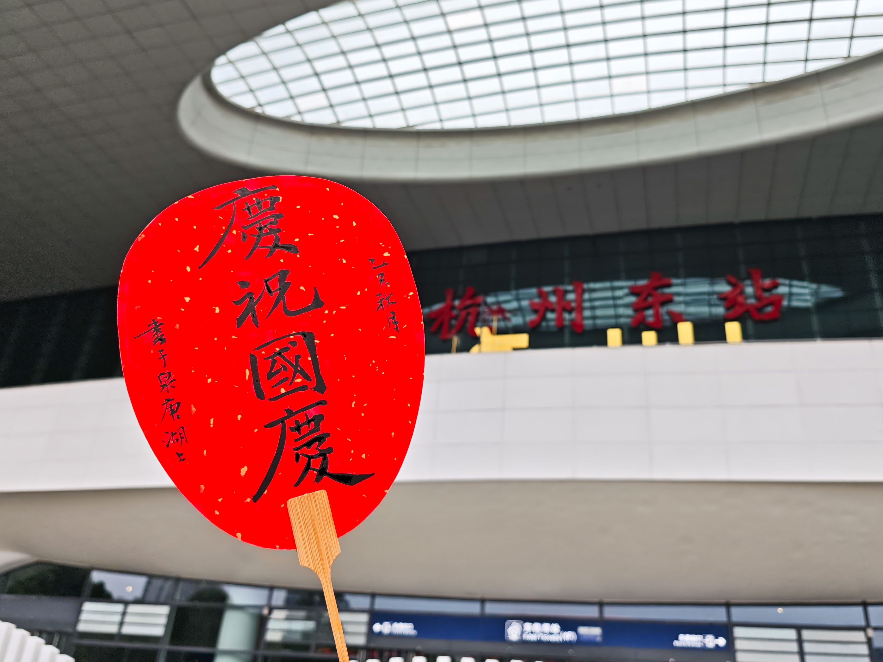 9月30日,由共青团上城区委、杭州东站枢纽管委会联合中国美术学院书法学院共同发起的“家国同心·月满华诞”——上城区“站小青”青年志愿赋美行动,在杭州东站东广场温暖启幕。