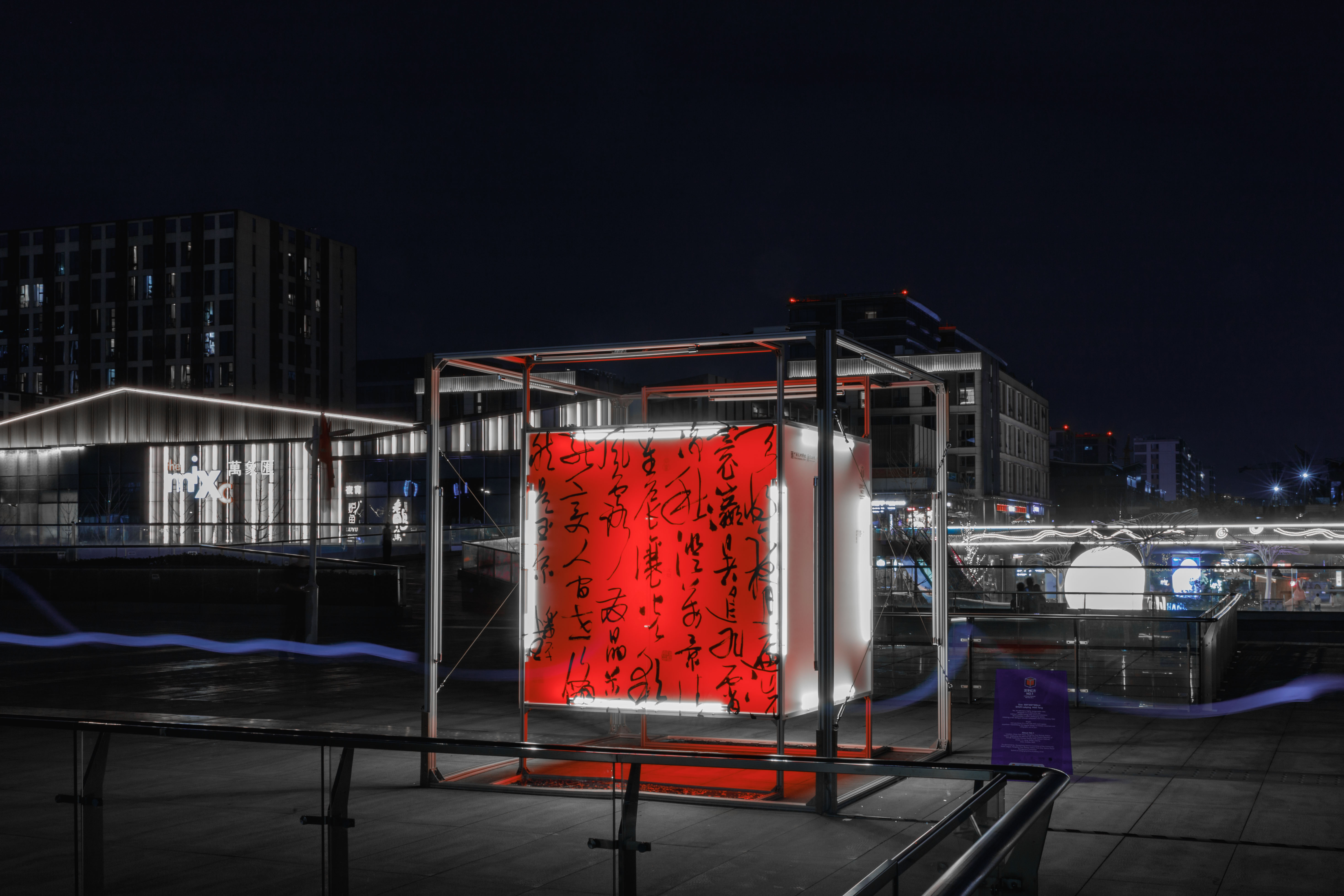 作品由沈乐平、毛腾老师共同创作。“我们选择了一个极好辨识的立方体,”沈乐平表示,“为它设计了一种特别的红色,使它嵌入到一些具有挑战性的空间,以期打开书法与新场域的新对话。”