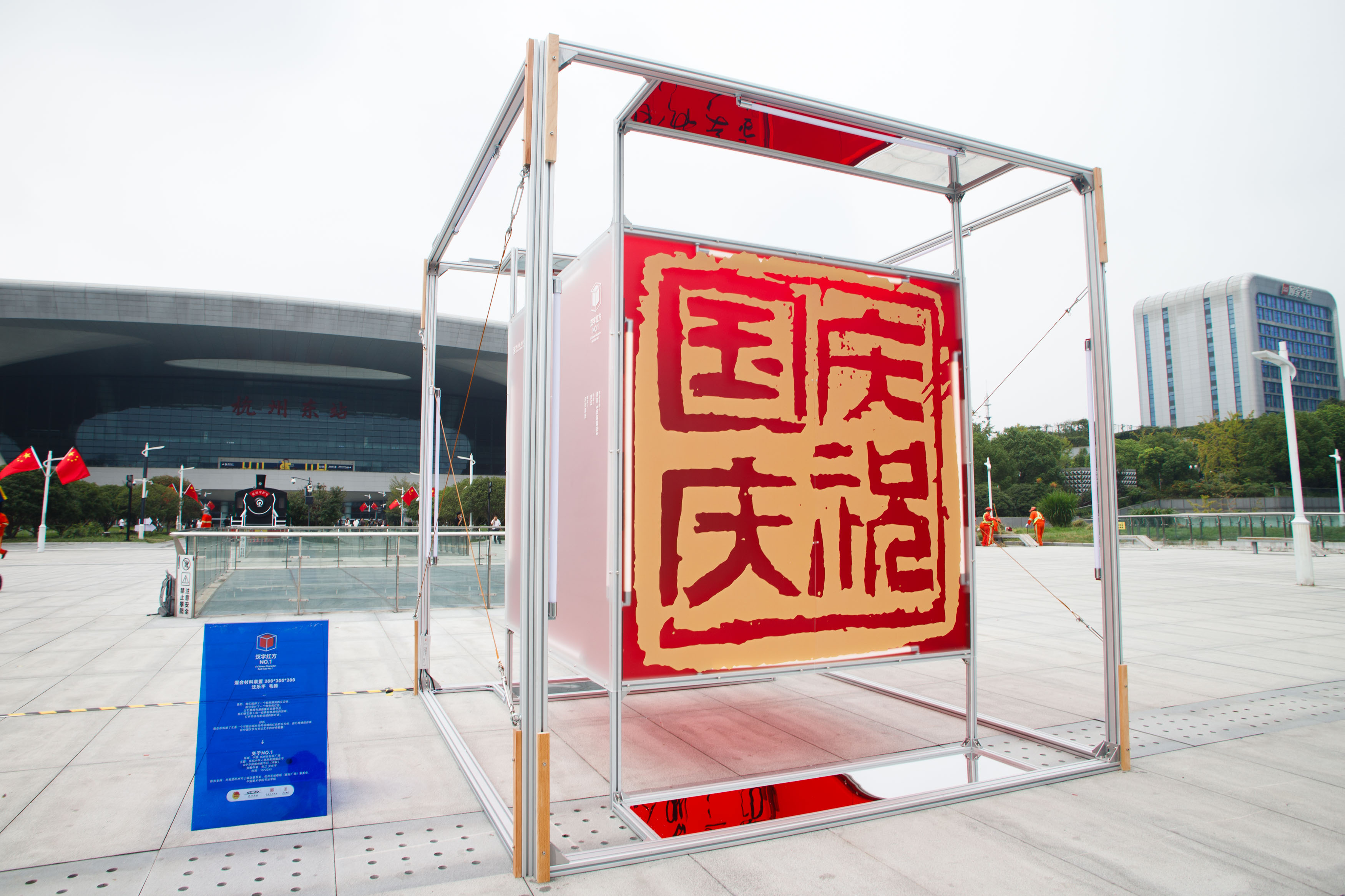 这个边长300厘米的红色立方体,一面呈现刘江先生篆刻《庆祝国庆》,以金石之力致敬祖国华诞;一面展示沈乐平教授草书斗方《刘禹锡<八月十五日夜玩月>》,以笔墨韵律咏叹中秋团圆。立方体在广场上构筑起一个独特的艺术场域,让匆忙的旅途因书法而停留,让传统的笔墨因空间而新生。