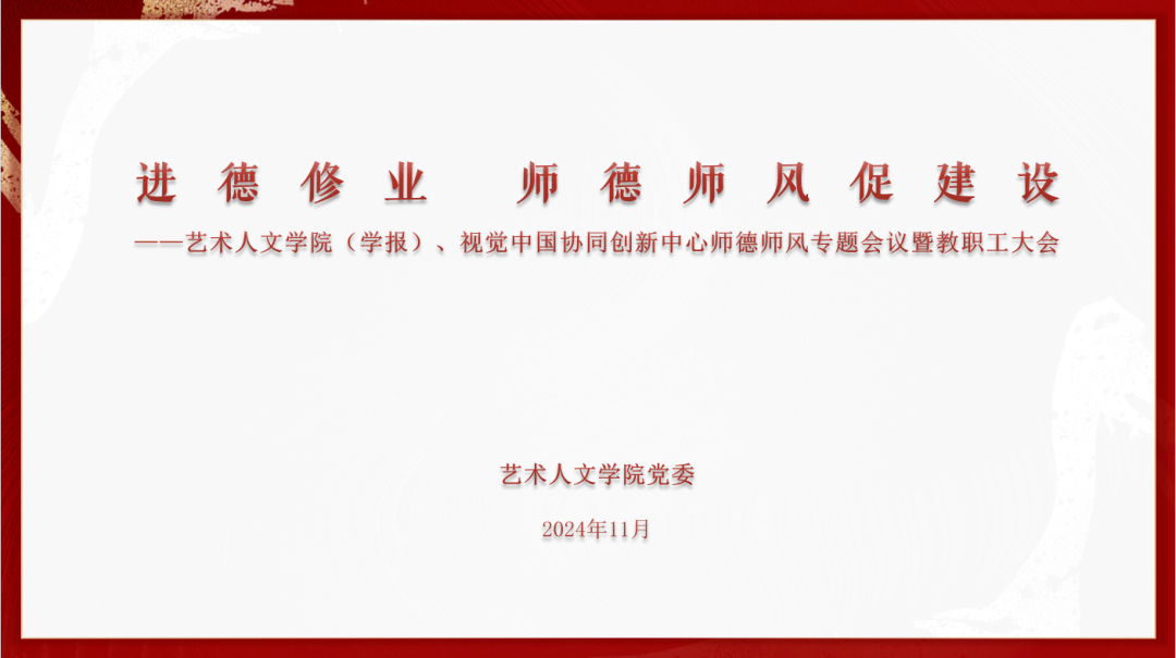 艺术人文学院党委在南苑大会议室组织召开“进德修业 师德师风促建设”专题教育活动,此次活动旨在学习贯彻全国教育大会精神,大力弘扬教育家精神,凝聚共识,共同营造尊师重教、知行合一、向上向善的人文环境。中国美术学院党委书记金一斌出席并做题为《文化如何化人》专题讲座,师德师风领导小组成员、教师代表、学生代表共计十二位与会人员做交流发言。会议由艺术人文学院党委书记兼副院长江河主持。中国美术学院人事处处长、人才办主任、教师工作部部长封治国、艺术人文学院副院长兼学报主编万木春、艺术人文学院常务副院长兼党委副书记范白丁、艺术人文学院副院长兼纪委书记董捷、视觉中国协同创新中心主任卢勇、视觉中国协同创新中心副主任雷子人、视觉中国协同创新中心副主任兼美术报副总编赵辉及三个单位全体教职工参加会议。
