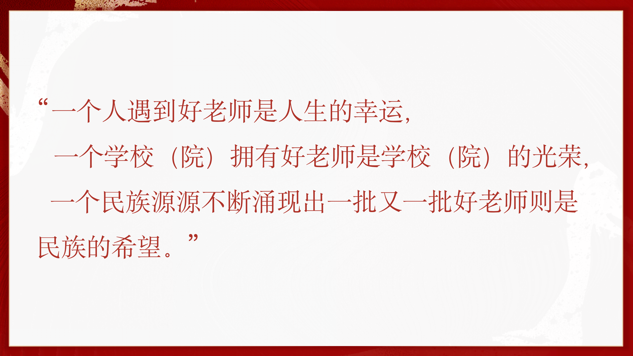 最后,江河总结:今天下午不仅是教育的会,也是关心关爱教师的会,是凝心聚魂,鼓荡崇德向善正能量的会!一个学院拥有好的老师是学院的幸运,各位老师务必自觉发挥主人翁精神,进德修业,择善而从,知行合一,保持终身学习心态,永葆对教育事业的热爱,与学校事业发展同向同行,成就人生理想!