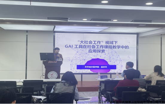 在2024 年度黑龙江省社会学学会、社会工作协会年会暨“东北全面振兴与社会治理创新”学术研讨会上,李洪龙、孟庆天二位老师分别以“健康中国背景下精神卫生专业集群建设的探讨”、“‘大社会工作’视域下 GAI 工具在社会工作课程教学中的应用探索”为题做了专题介绍。