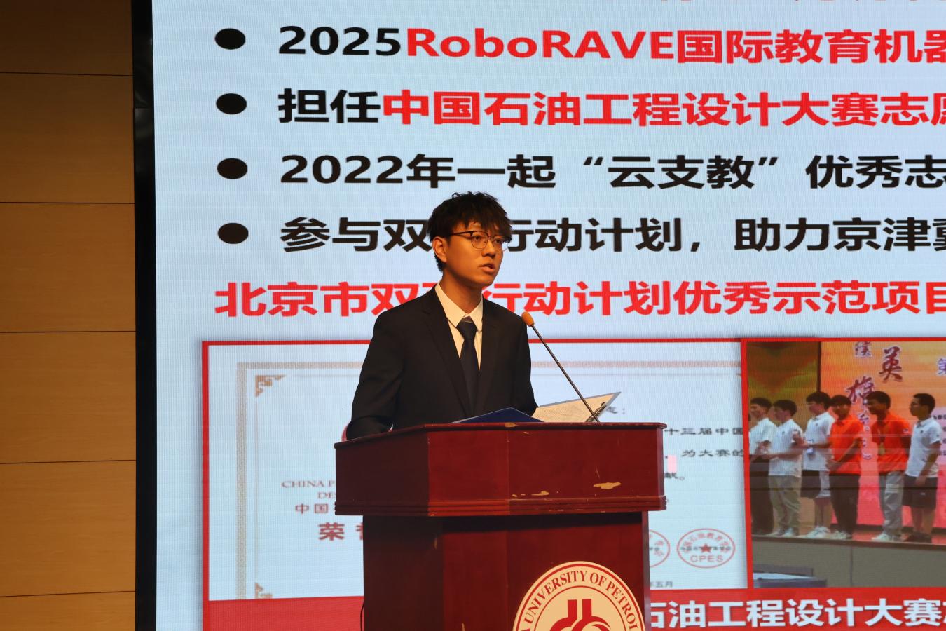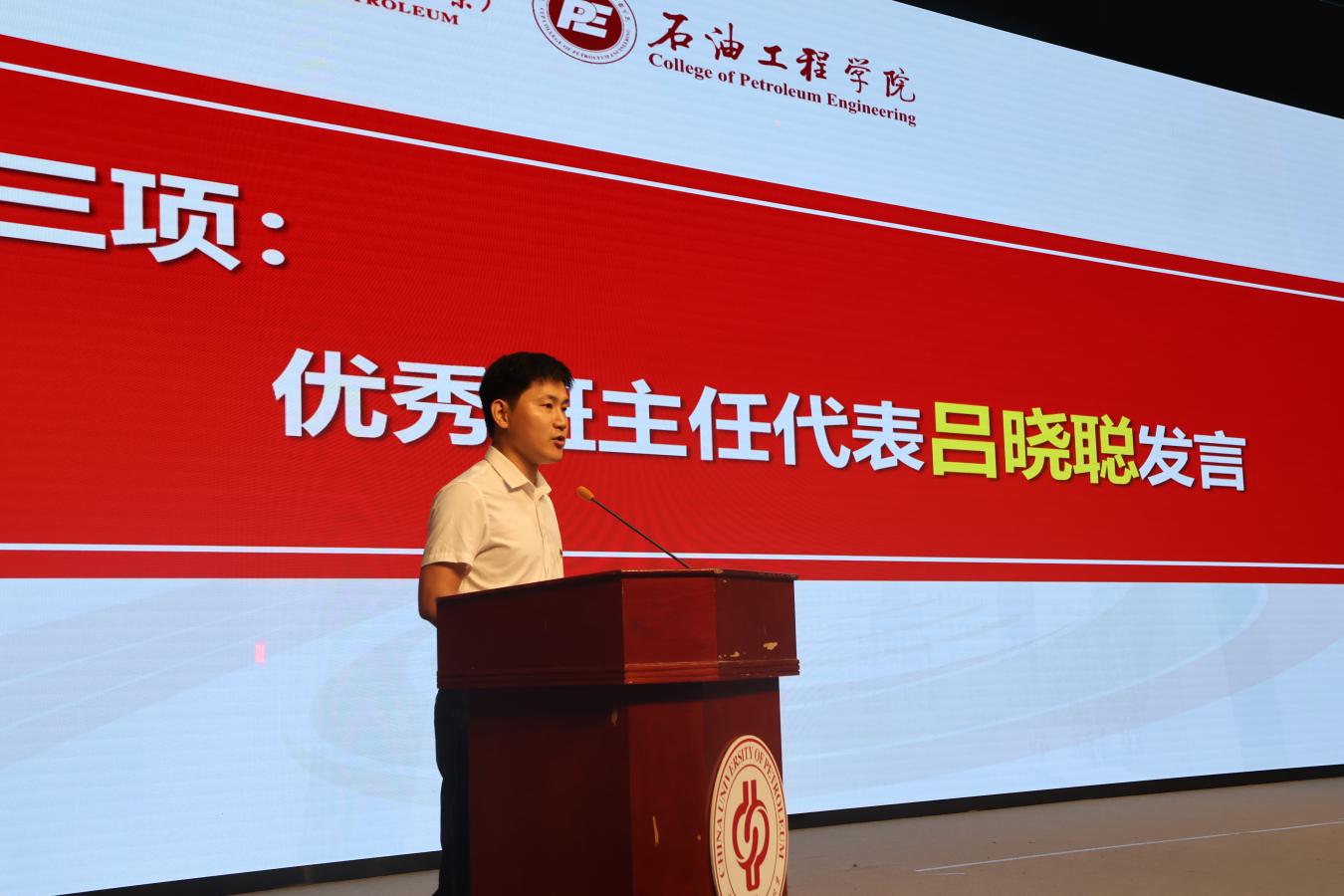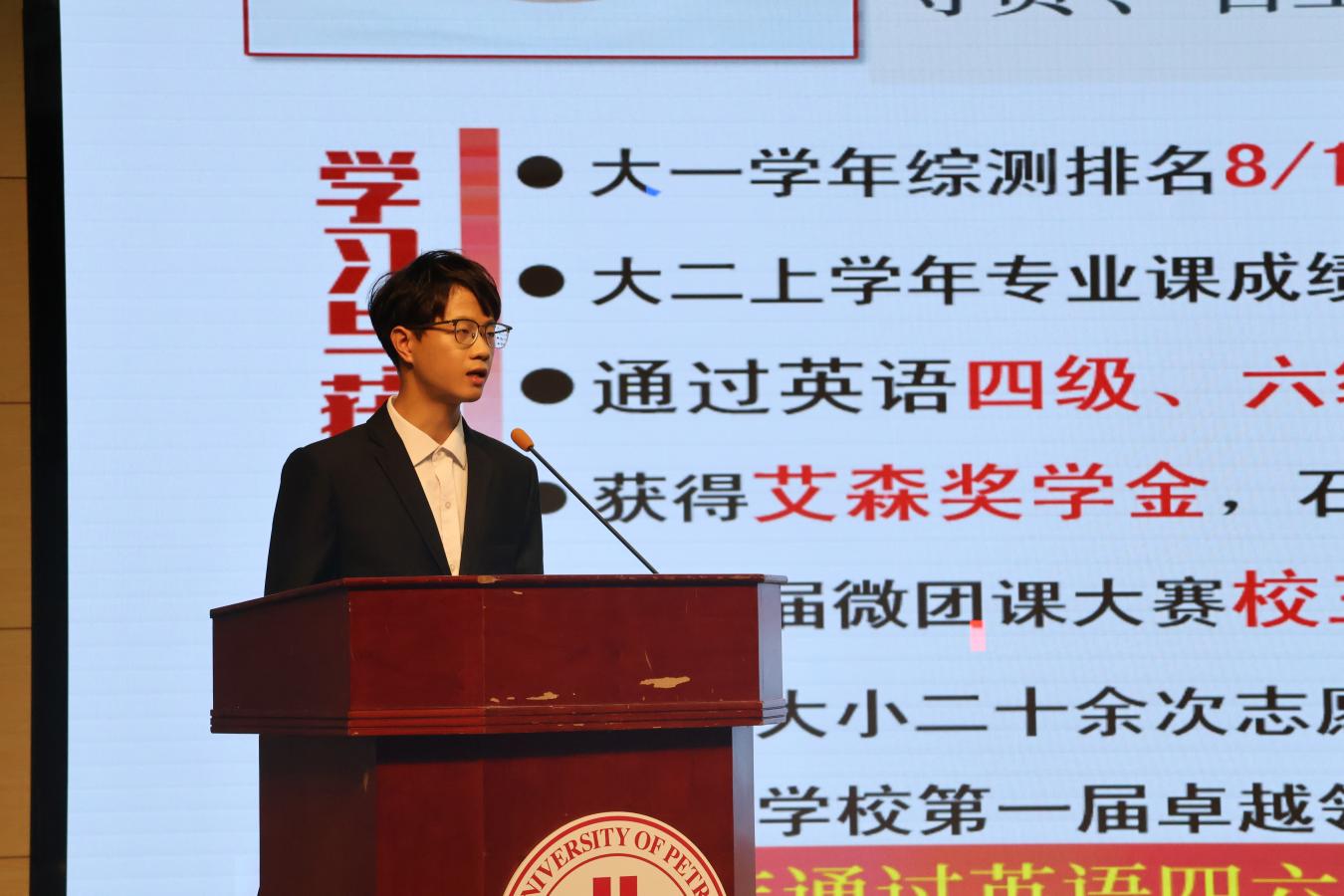 2022级本科生张泽驿作为朋辈辅导员代表发言。他分享了本科三年的学习、科研、实践、社会工作经验,勉励同学们坚持对理想的不懈追求、躬耕自己的精神田园,并祝愿大家在中石大石油工程学院绽放最美的光彩。