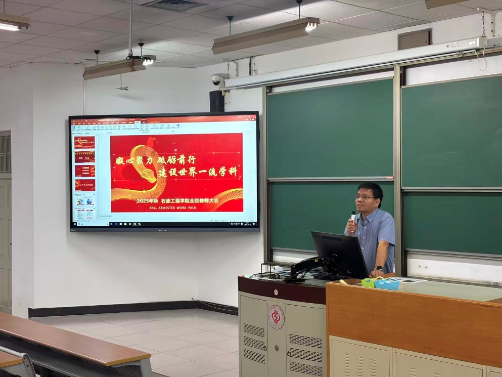 秋风送爽,丹桂飘香。近日,石油工程学院召开2025年秋季学期工作部署会暨师德师风警示教育大会。学院领导班子成员及全体教职工参加会议。院长宋先知以“凝心聚力、砥砺前行,建设世界一流学科”为题,全面总结上半年工作,深入分析当前学院高质量发展面临的新形势与新挑战,并对新学期重点任务作出部署。学院纪委书记、副院长刘伟作师德师风警示教育专题报告。会议由学院党委书记黄世军主持。