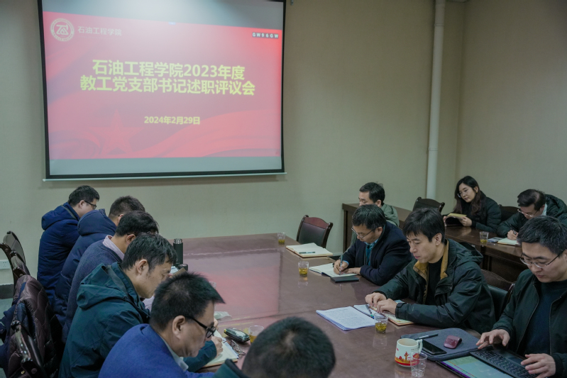油气藏工程研究所党支部、油气井工程研究所党支部、油气开采工程研究所党支部、油气田化学研究所党支部、海洋油气工程研究所党支部、智能油气田研究所党支部、实验教学中心党支部、学院机关党支部的8位党支部书记聚焦履行工作责任情况、支部工作进展情况和成效、学习贯彻习近平新时代中国特色社会主义思想主题教育工作开展情况、推进创新性工作情况、存在的突出问题及加强和改进工作的思路措施等五个方面进行述职,重点围绕学习贯彻习近平新时代中国特色社会主义思想,贯彻落实学校第十二次党代会精神,以及推进“一融双高”成效等方面做了汇报,全体参会人员进行现场打分评议。