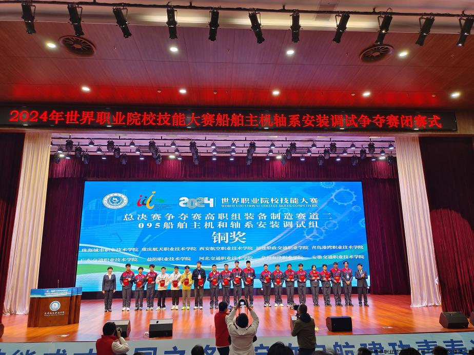 2024年10月27日至30日,备受瞩目的2024年世界职业院校技能大赛总决赛争夺赛——“船舶主机和轴系安装调试”赛项在天津隆重举行。机电工程学院党总支教师党支部党员马旭、王锦潮老师发挥先锋模范作用,精心指导刘洪轩、颜润欣、吴锦洵、李荣欣四位同学组成的参赛队伍,凭借优异的表现荣获铜奖。学院连续八年参加此赛项,并第九次获奖,展现了我院在党建引领下教育教学的卓越成果。