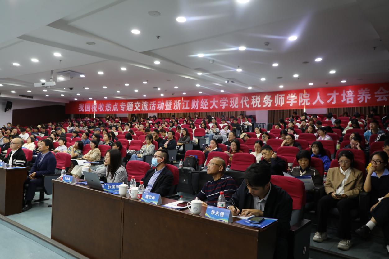为贯彻落实党的二十届四中全会精神,“推动科技创新和产业创新深度融合,一体推进教育科技人才发展”,2025年10月25日下午,学院协办的“我国税收热点专题交流活动暨浙江财经大学现代税务师学院人才培养会”,在学术中心第四报告厅成功举办,以期推进产教融合、校企融合,促进人才培养。浙江省总会计师协会会长陈焕昌,浙江省总会计师协会常务副会长俞乐平,浙江省总会计师协会秘书处行政专员黄敏,浙江财经大学现代税务师学院院长司言武教授,浙江财经大学财政税务学院原院长沈玉平教授,浙江省注册税务师协会副会长徐珺婷,浙江省总会计师协会常务理事、税务咨询专业委员会主任何建军,浙江六善律师事务所金融财税事务部主任黄益助,浙江省总会计师协会税务咨询专业委员会、中介工委秘书长李斌,北京中科通量科技有限公司财务总监、浙江省总会计师协会理事沈红霞,浙江省总会计师协会股份工委副主任盛忠伟,浙江省总会计师协会股份工委高级顾问张国昀,浙江省总会计师协会新安江工委主任吴耀,以及来自省内外企事业单位从事税务、财务管理的实务工作者及教师、学生等共计一百八十余人参加了本次活动。会议由浙江财经大学财政税务学院副院长张帆主持。