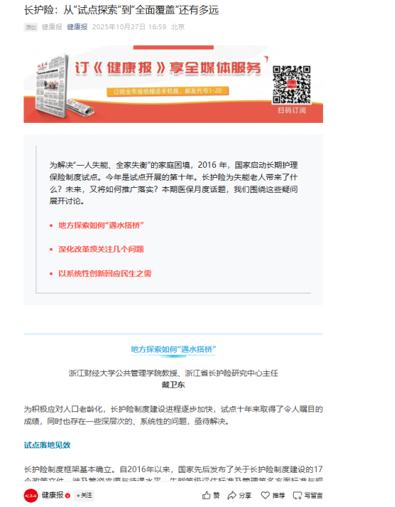 近日,我院教授戴卫东接受《中国妇女报》《健康报》等多家媒体专访,就“十五五”规划建议中养老保障相关举措进行解读。戴卫东指出,“十五五”期间推行长期护理保险是促进人口高质量发展的重要举措,提出长护险应遵循“按人群分类、按服务分级”原则,构建覆盖失能失智老年人的康养护一体化服务体系,并建议通过长护险与医保协同支付康复护理、安宁疗护费用。此次解读系统阐释了“十五五”期间养老保障制度创新与老年人力资源开发的双重目标。一起来看看!