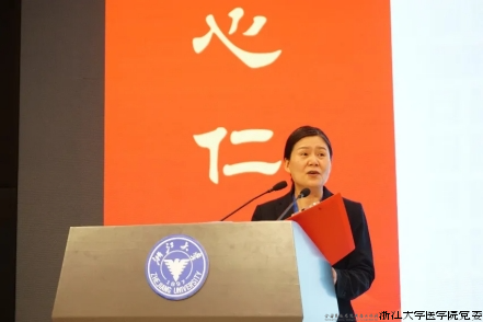 伴随着庄严的国歌声,大会进入正式会议第一阶段。浙江大学医学院党委副书记陈周闻在讲话中肯定了医学院学生会过去一年所取得的进步和成就,并对本次大会的召开表示热烈祝贺。她强调要以党中央和习近平总书记对新时代青年的期盼为前进方向,希望新一届学生会能够坚定理想信念,全面落实工作;能够以创新为基,敢于作为,将人工智能落实到学生会服务体系构建中,构建智慧学生会;能够发挥服务学生优势,构建师生信任纽带。