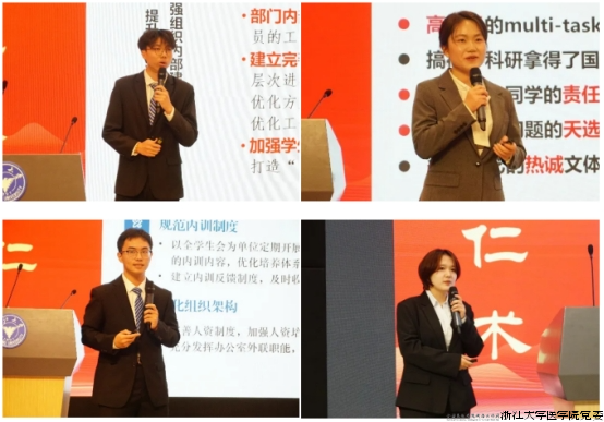 浙江大学学生会主席团成员陈彦廷在致辞中对大会召开表示热烈祝贺。他高度评价医学院学生会在思想引领、服务同学等方面发挥的积极作用,充分肯定医学院学生会过去一年在深化组织改革、创新活动形式等工作中取得的显著成效。陈彦廷强调,学生会组织应始终秉持"全心全意为同学服务"的宗旨,并期待浙江大学学生会与医学院学生会继续深化合作,凝心聚力搭建更优质的服务平台,共同推动学生工作高质量发展。
