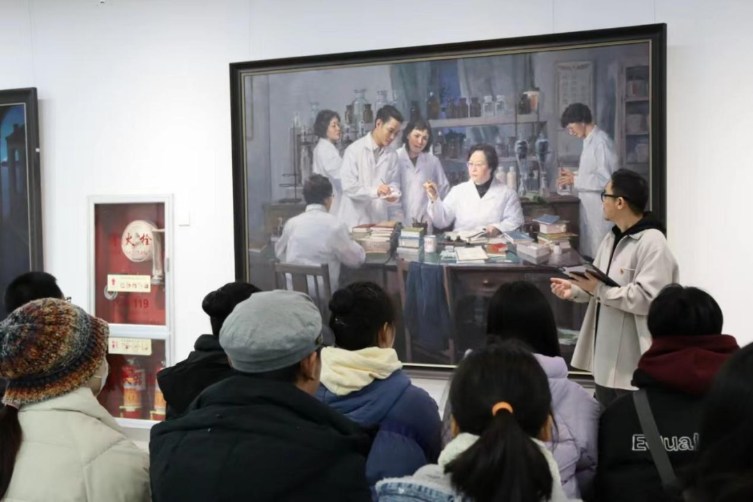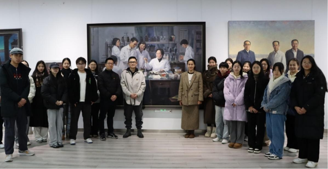 此次红课,吴威教授以油画《呦呦鹿鸣》为重要载体展开。该油画以共和国勋章获得者、中国首位诺贝尔医学奖获得者屠呦呦与其团队核心成员一起在实验室的场景为画面的主题,反映了以屠呦呦为组长的科研团队经过无数次的实验与失败之后,终获青蒿抗疟发掘成功。吴威阐述了作品在构图上借鉴卡拉瓦乔、伦勃朗等美术史经典群像名作,合理安排人物的主次关系、互动关系,注重画面黑白灰节奏布局,暖灰色调更显历史凝重感,并希望同学们勇担时代使命,传承红色基因,努力创作出表现民族精神和时代精神的艺术作品。