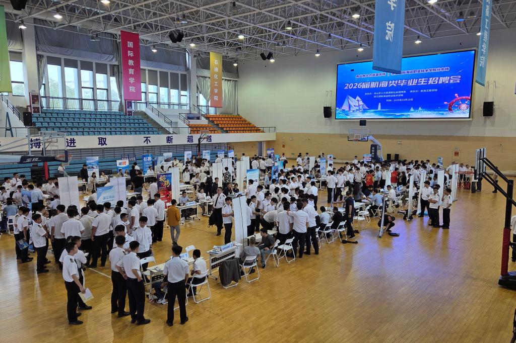下午,由舟山市人力资源和社会保障局和我校共同主办,航海工程学院承办的2026届航海类毕业生现场招聘双选会在体育馆举行。毕业生们着装整齐,在班主任、专业教师的指导下,手持精心准备的简历和自荐信,积极与用人单位招聘人员洽谈,推荐自我。校党委书记蔡志军、校长吴中平、副校长李丽及航海工程学院领导深入招聘会现场,一一与企业沟通交流,了解企业的用人需求,并鼓励学生积极投递简历,找到自己满意的工作。