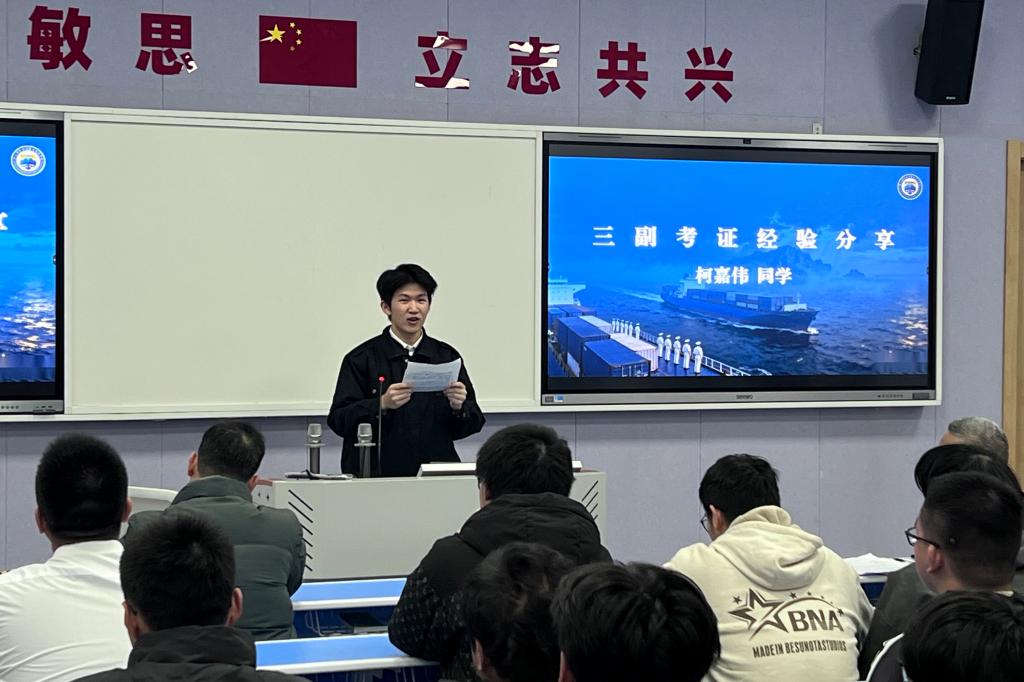 随后,顺利通过三副考证的优秀学生代表柯嘉伟同学登台分享备考经验。他详细剖析了备考过程中的学习规划、复习重点以及应试技巧,着重指出合理安排学习时间、精准把握考试要点、反复练习真题的重要性。