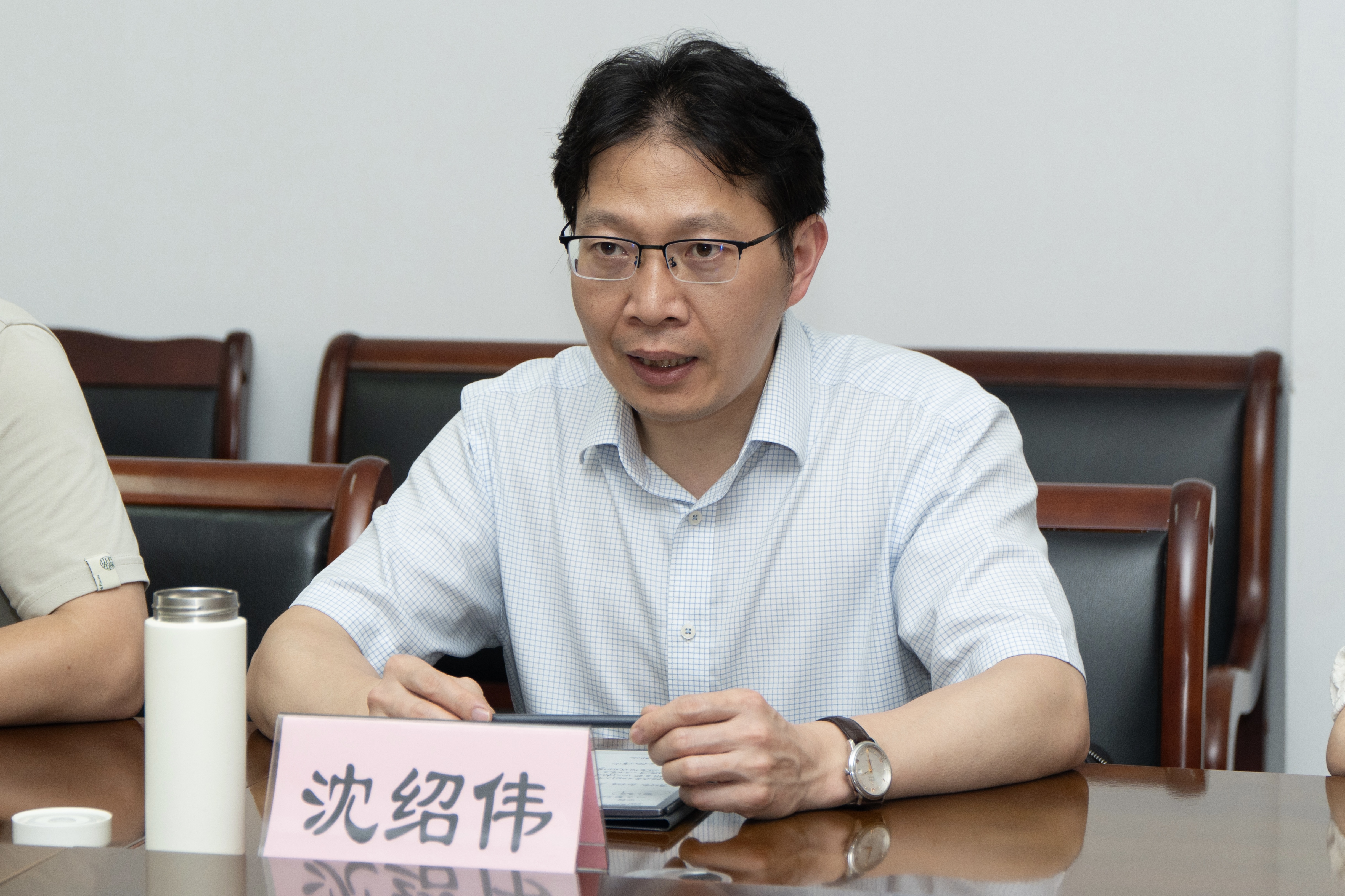 沈绍伟感谢大墅镇的热情接待,并介绍了学校与学院的基本情况。他指出,要保持大墅镇与高校间的联系,构建常态化的交流机制,通过校地共建青春助农直播间加强交流协作。他强调当代青年应积极投身基层,实现自我价值。最后,他向同学们提出四点要求,希望同学们“多行”“多看”“多听”“多思”,期待统数青年在此次社会实践中大有所为。