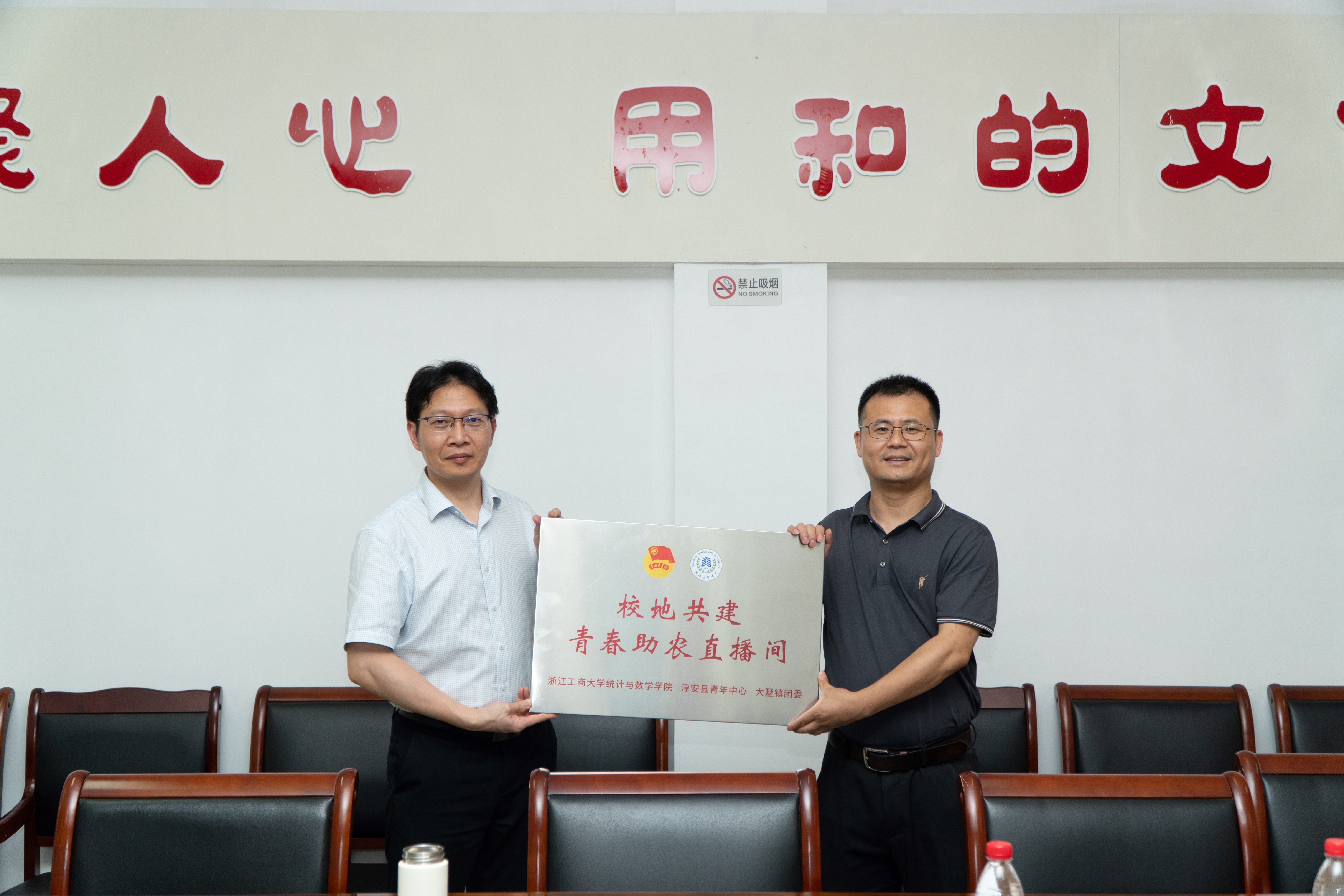 最后进行揭牌仪式,胡春槐与沈绍伟为校地共建青春助农直播间揭牌。