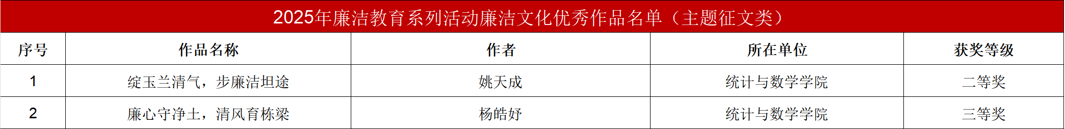 为推动深入贯彻中央八项规定精神学习教育走深走实,聚焦立德树人根本任务,加强新时代校园廉洁文化建设,根据《关于组织开展2025年廉洁教育系列活动的通知》相关要求,学校组织开展了2025年廉洁教育系列活动。统计与数学学院在此次廉洁教育系列活动评审中喜获佳绩,其中创意设计类作品《破腐倡廉》、《守正方心》荣获一等奖,主题征文类作品《绽玉兰清气,步廉洁坦途》荣获二等奖、《廉心守净土,清风育栋梁》荣获三等奖。