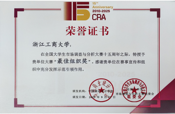 9月27日在北京对外经济贸易大学召开的“全国大学生市场调查与分析大赛十五周年纪念暨第十六届启动会”上,我校凭借卓越的组织工作与突出贡献,荣获“赛区最佳组织奖”和“省赛突出贡献奖”两项集体荣誉。