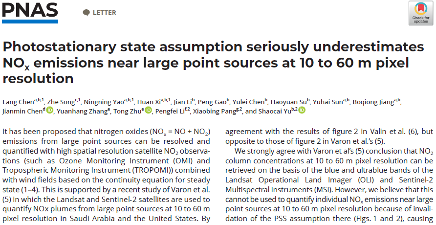 近日,我院师资博士后陈浪、博士研究生姚宁宁、奚欢与导师俞绍才教授合作在顶级期刊《Proc Natl Acad Sci USA(PNAS)》上发表了题为“Photostationary state assumption seriously underestimates NOx emissions near large point sources at 10 to 60 m pixel resolution(光稳态假设严重低估了卫星10至60米成像分辨率下大型点源附近的NOx排放量)”的学术论文。浙江工商大学统计与数学学院是本论文的第一完成单位。