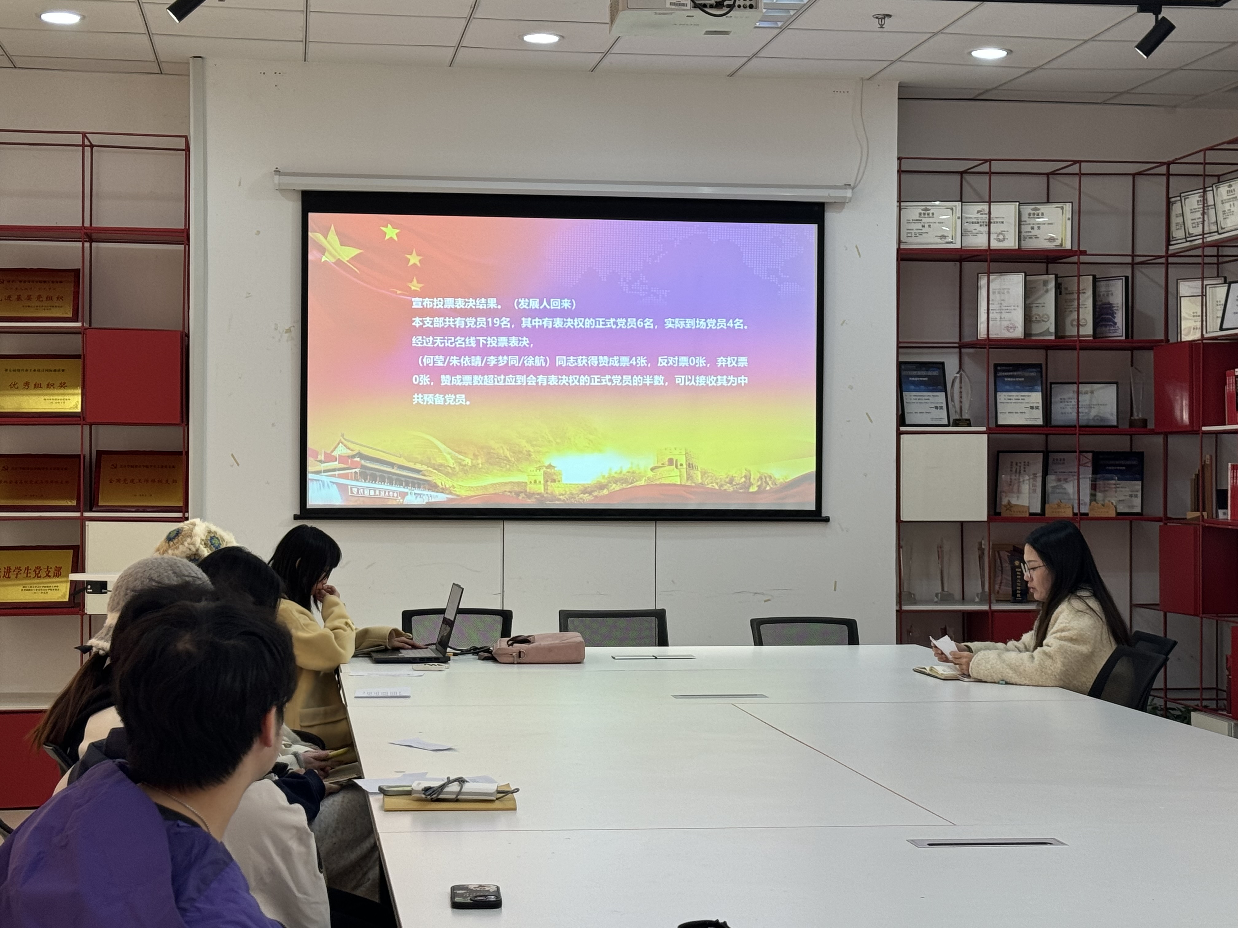 会上,4位拟转预备的入党积极分子依次宣读入党志愿书,汇报大学期间在思想、学习、实践等方面的成长与表现,深刻表达对党的忠诚与入党的决心,同时认真剖析自身的进步与不足。随后,入党介绍人分别介绍发展对象的培养考察情况,并发表是否同意其加入党组织的意见。经过与会正式党员无记名投票表决,大会一致同意接收4位入党积极分子为中共预备党员。会议最后,支部书记作总结发言,她向新晋预备党员致以衷心祝贺,同时激励在场全体正式党员与预备党员,在今后的学习和生活中要以党员标准严格要求自己,勤学笃行、锤炼本领,充分发挥共产党员的先锋模范作用。