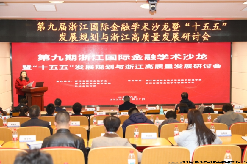 2025年11月27日,第九期浙江国际金融学术沙龙暨“十五五”发展规划与浙江高质量发展研讨会在浙江经济职业技术学院成功举办。浙江省国际金融学会会长、浙江省特级专家、浙江大学博士生导师金雪军,中国人民解放军陆军大校、杭州海关原总工程师、浙江省国际金融学会顾问余月其,浙江经济职业技术学院校长柯孔林,浙江省发展规划研究院首席专家、区域高质量中心执行主任朱李鸣,浙江大学金融研究院副院长章华,浙江财经大学中国政府监管研究院院长金通,浙江工业大学经济学院学术副院长何新江,杭州师范大学经济学院金融系主任卢锐以及行业相关部门负责人、学术联盟成员单位的专家学者、会员代表、科研及金融机构代表等70余人参会。会议由学校数字财经学院院长王茜、浙江国际金融学会副秘书长夏玮蔓共同主持。