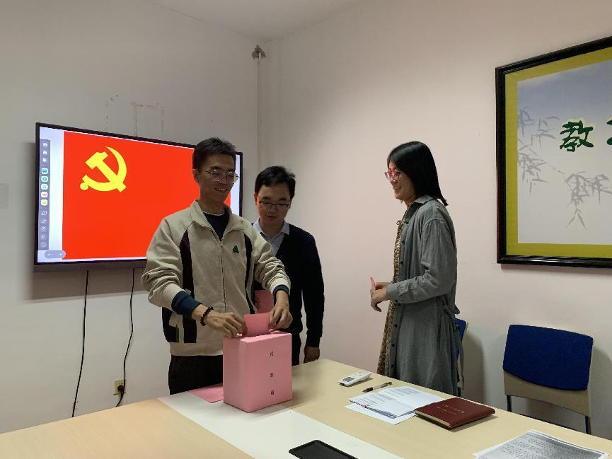 根据换届选举程序要求,首先全体人员起立,奏唱国歌。随后,赵典同志对上届支部工作进行了总结汇报,现场宣读参与本次换届选举的候选人名单并集体通过了换届选举办法,正式投票选举环节随之开始。经过无记名投票差额选举方式,赵典同志宣读了本次选举结果报告单。依据本次选举办法和计票结果,童国秀、陆海峰、胡恩来3位同志获得赞成票超过实到会有选举权的党员人半数,当选为无机化学研究生党支部新一届支部委员成员,其中,童国秀同志为新一届党支部委员会书记。依据选举办法与工作条例,本次换届选举会议合法,结果有效。