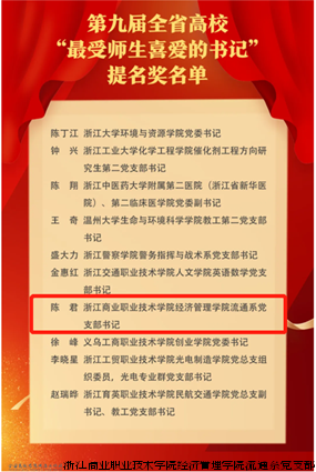 近日,浙江省第九届全省高校“最受师生喜爱的书记”选树宣传活动评选结果公布,我校经济管理学院流通系党支部书记陈君从近百名高校书记中脱颖而出,获评“最受师生喜爱的书记”提名奖。