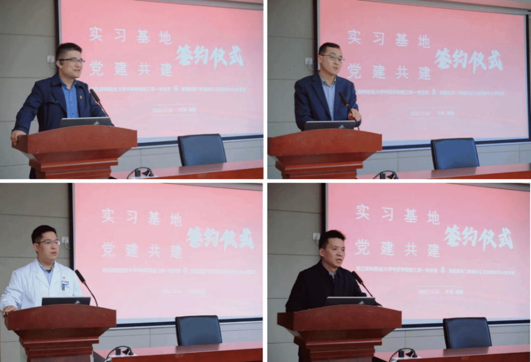 签约仪式上,海曙区卫生健康局党委委员、副局长胡剑对学校一直专注医药健康事业专业人才培养给予了高度认可,并围绕党建联建、政校企协同助推“健康宁波”事业发展提出了希望:一是党建引领,擦亮“红色底色”,希望合作双方以党建联建为纽带,深化理论联学、人才联育、活动联办、困难联解,将党建引领贯穿到业务合作的全过程,打造基层党建与事业发展互促共进的示范标杆;二是校地协同,激活“发展引擎”,实习基地的建立,标志着合作双方在“产学研用”一体化发展上迈出关键一步。希望学校专家团队能下沉基层社区,将中医药济世为民的文化基因转化为服务民众健康亟需的“金钥匙”,助力打造“健康宁波”新样板。