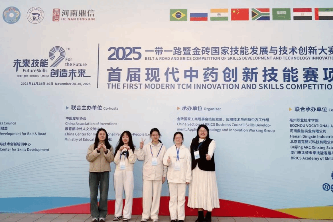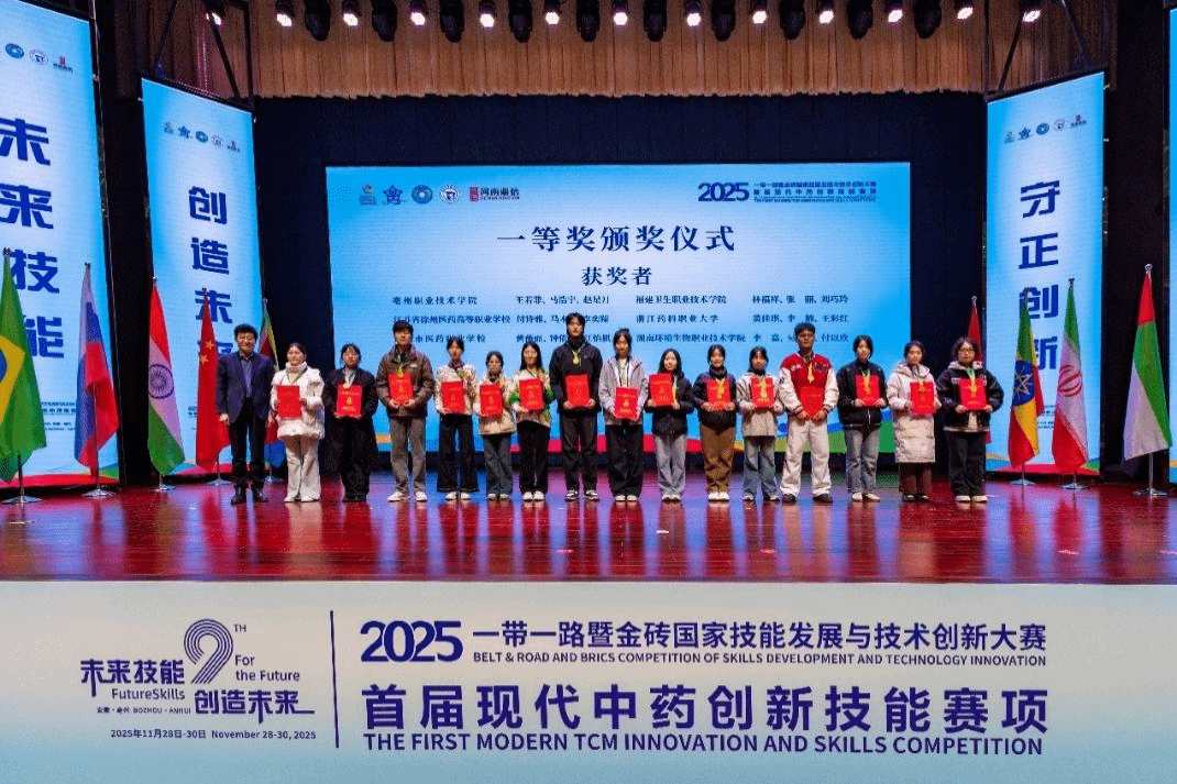 2025年11月29日,2025年“一带一路暨金砖国家技能发展与技术创新大赛首届现代中药创新技能竞赛”在安徽亳州圆满落幕。支部党员沙秀秀同志带领中药学专业学生黄佳琪、李楠、王彩红凭借扎实的专业知识、娴熟的操作技能和出色的临场发挥,从来自全国60所医药院校的优秀学子中脱颖而出,荣获大赛一等奖、“最佳组织奖”,沙秀秀、刘诗行还获评“优秀指导教师奖”。